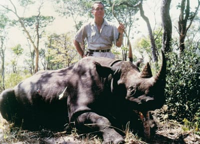 Bill had done a lot of thinking by then and had reached the conclusion that you weren’t really bowhunting dangerous game unless you faced the danger without a rifle behind you. He made this plain as he started to plan his delayed return to Africa, and needless to say he had trouble finding a reputable PH who would agree to those terms. With two elephants under his belt already, “all” he needed to complete the mission was a leopard, lion, buffalo, and rhino. Furthermore (Bill never seemed able to resist the impulse to make hard things harder) he decided he wasn’t going to settle for the relatively docile white rhino, which he was familiar with from earlier trips. His would have to be a smaller but much more aggressive and dangerous black rhino, and they were already growing scarce everywhere they once roamed in abundance. (Today, black rhino hunting is completely banned throughout Africa.)