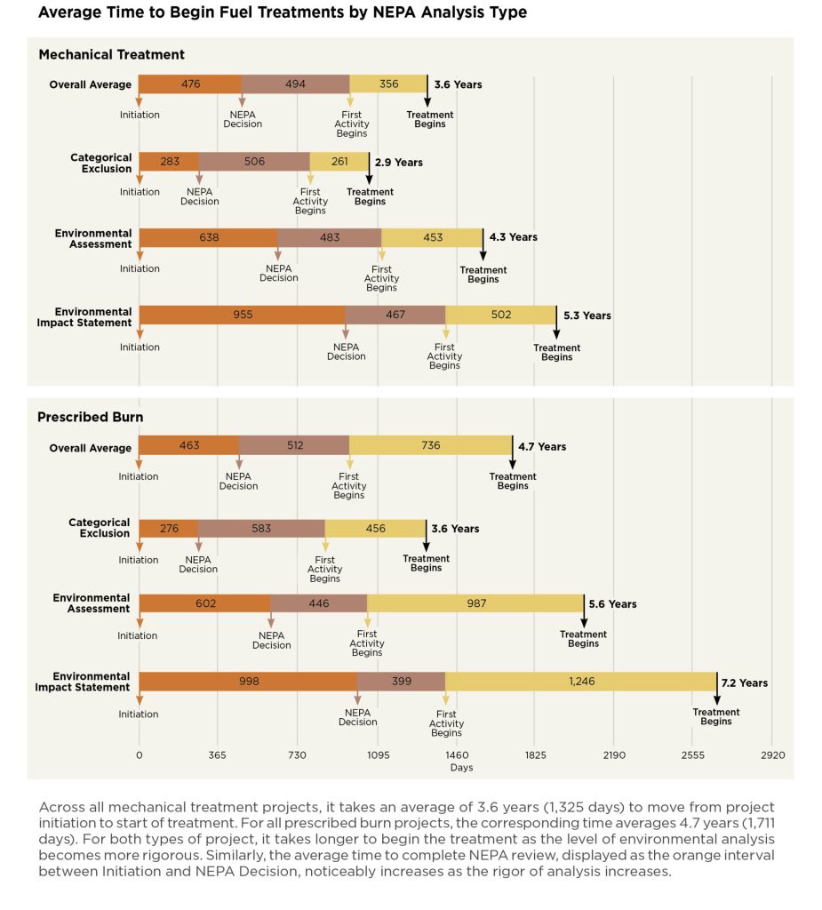 Quoting the authors, “Across all mechanical fire-treatment projects, it takes an average of 3.6 years (1,325 days) to move from project initiation to start of treatment.