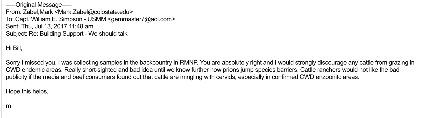 "The study concludes: "The reduction or elimination of 'predator-removal programs' may result in an increase in forage availability for wildlife and livestock."Prion diseases can potentially jump species according some published studies and according to Dr. Zabel: