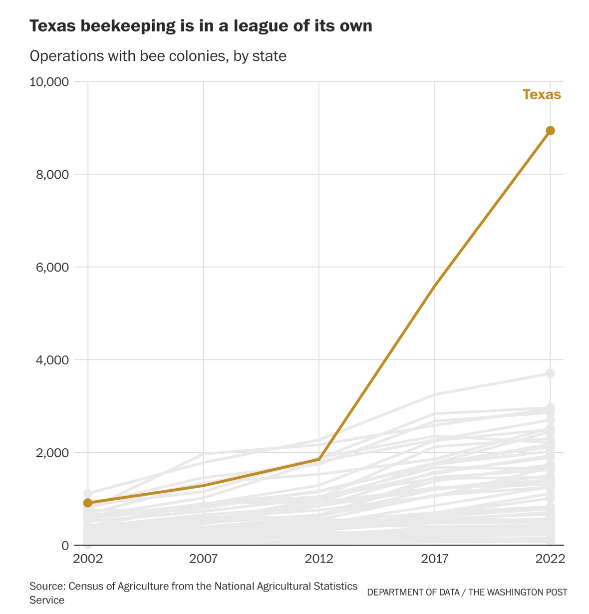 Much of the explosion of small producers came in just one state: Texas. The Lone Star State has gone from having the sixth-most bee operations in the country to being so far ahead of anyone else that it out-bees the bottom 21 states combined.