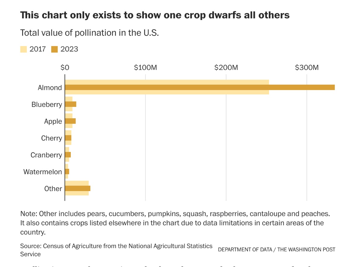 When the census was taken in December 2022, California had more than four times as many bees as any other state. We emailed pollination expert Brittney Goodrich at the University of California at Davis, who explained that pollinating the California almond crop “demands most of the honeybee colonies in the U.S. each year.”