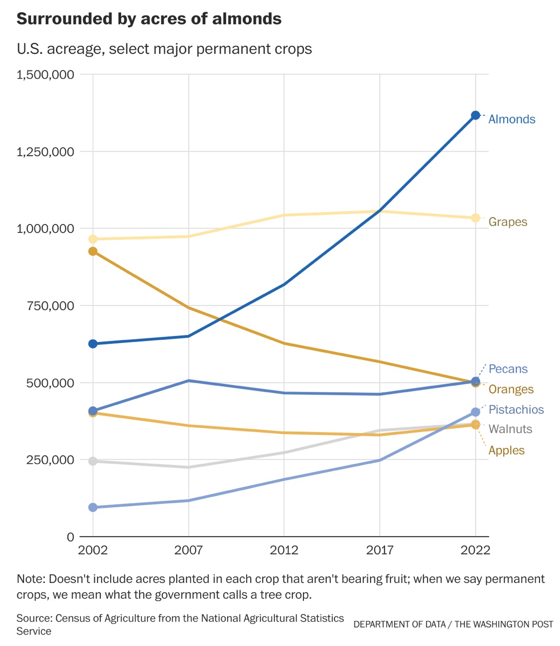 America’s almond acreage has more than doubled since 2007 as the world’s food firms race to stuff the nut into every conceivable granola mix, nut butter and milk substitute. So it seems reasonable to assume the honeybee population doubled along with it. After all, those almonds aren’t pollinating themselves.